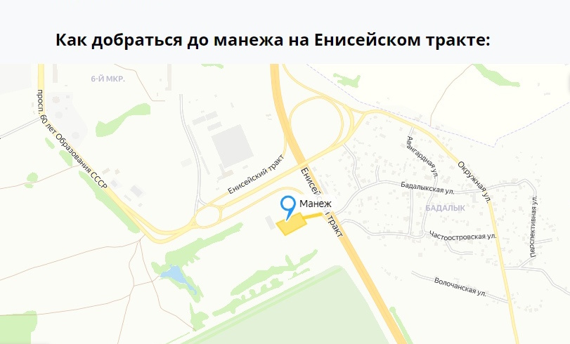 Автомобилем со стороны центра: сразу за деревней Бадалык и мостом развязки съезжаете с Енисейского тракта вправо (дорога на Солнечный), двигаетесь до кольца и с кольца третий съезд (вниз, назад в сторону центра), между автобусной остановкой "ДЕРЕВНЯ БАДАЛЫК" и знаком "уступи дорогу" через низкий раздолбаный бордюр вправо, по технической гравийной дороге к манежу. Если бить машину по гравийке не хочется, то можно загодя оставить авто на парковке напротив д.Бадалык (обозначена знаком, въезд через пешеходный переход